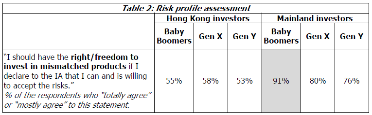 Mainland investors are more ready to invest in mis-matched products, with 82% saying they should have such a right. Baby boomers in particular hold such a view. (Table 2)